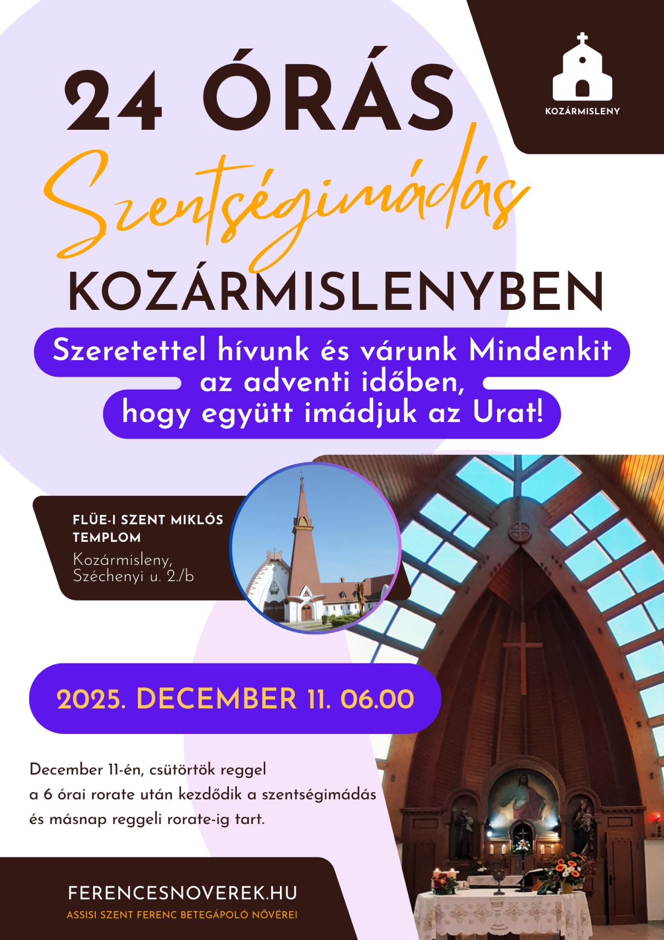 Kozármislenyben december 11-én, csütörtök reggel a 6 órai rorate után kezdődik a szentségimádás és másnap reggeli rorate-ig tart.